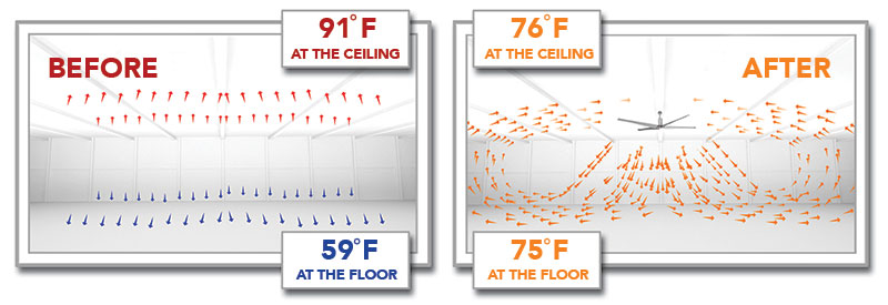 Werden HVLS-Ventilatoren im Winter eingesetzt, vermischen sie die warme Luft an der Decke mit der kühleren Luft am Boden und gleichen so die Temperatur im gesamten Raum aus (siehe Grafik unten). Dieser Prozess, der als Umwälzung oder Entschichtung bezeichnet wird, kann die Energiekosten eines Betriebs um bis zu 30% senken, was einer üblichen Amortisationszeit von 6 Monaten bis 2 Jahren für unsere Ventilatoren entspricht.